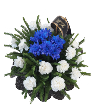 Leinakimp ümar, valge nelk ja sinine krüsanteem.